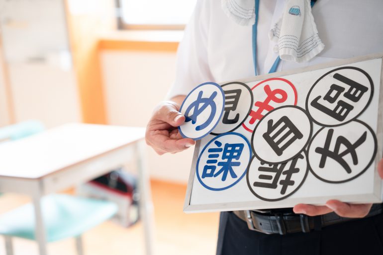 授業で使用するマグネット。授業冒頭はめあての「め」もしくは課題の「課」を使う。