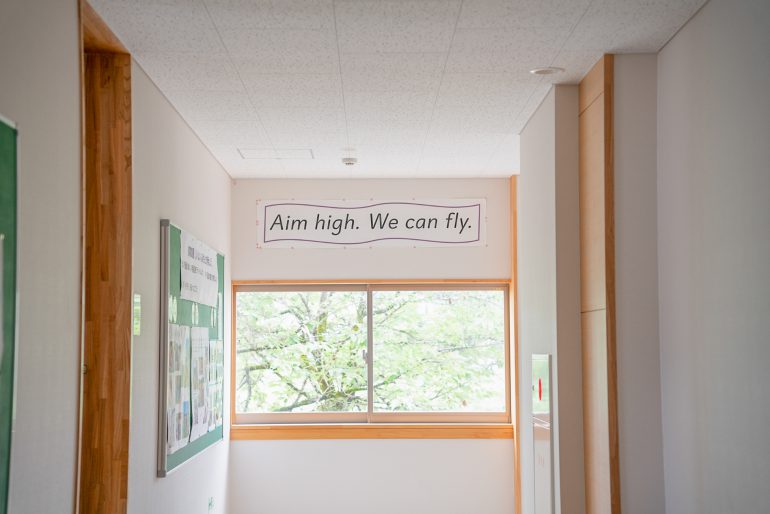 学校教育目標「志を持って挑戦し、未来を切り開く児童生徒」の英語版。校内随所に掲示されている。