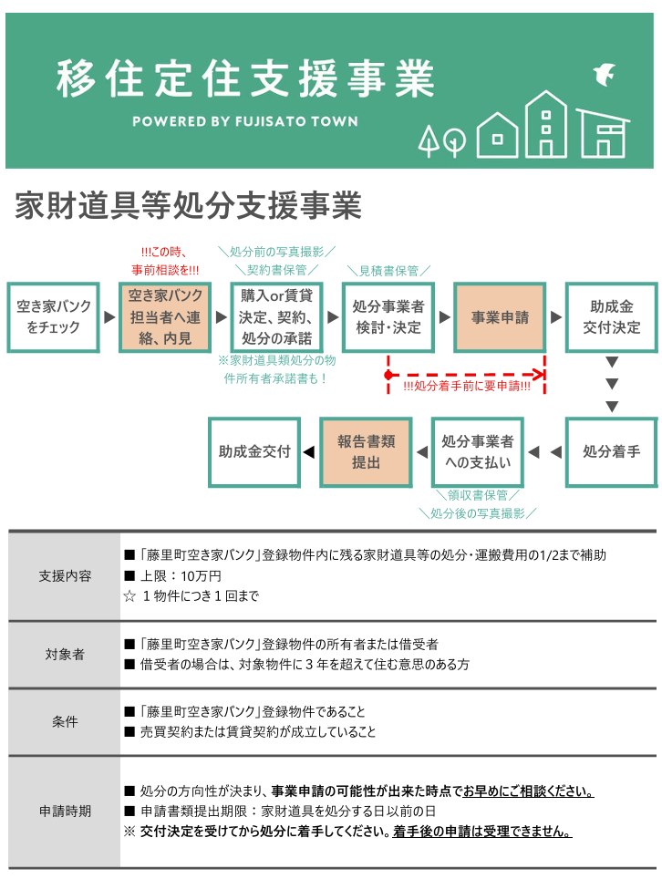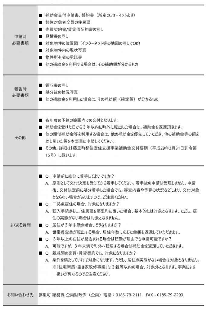 「藤里町空き家バンク」に登録された空き家に残る家財道具処分費用の一部を助成します。処分着手「前」の申請が必要ですので、申請の可能性が出てきたらお早めにご相談ください!